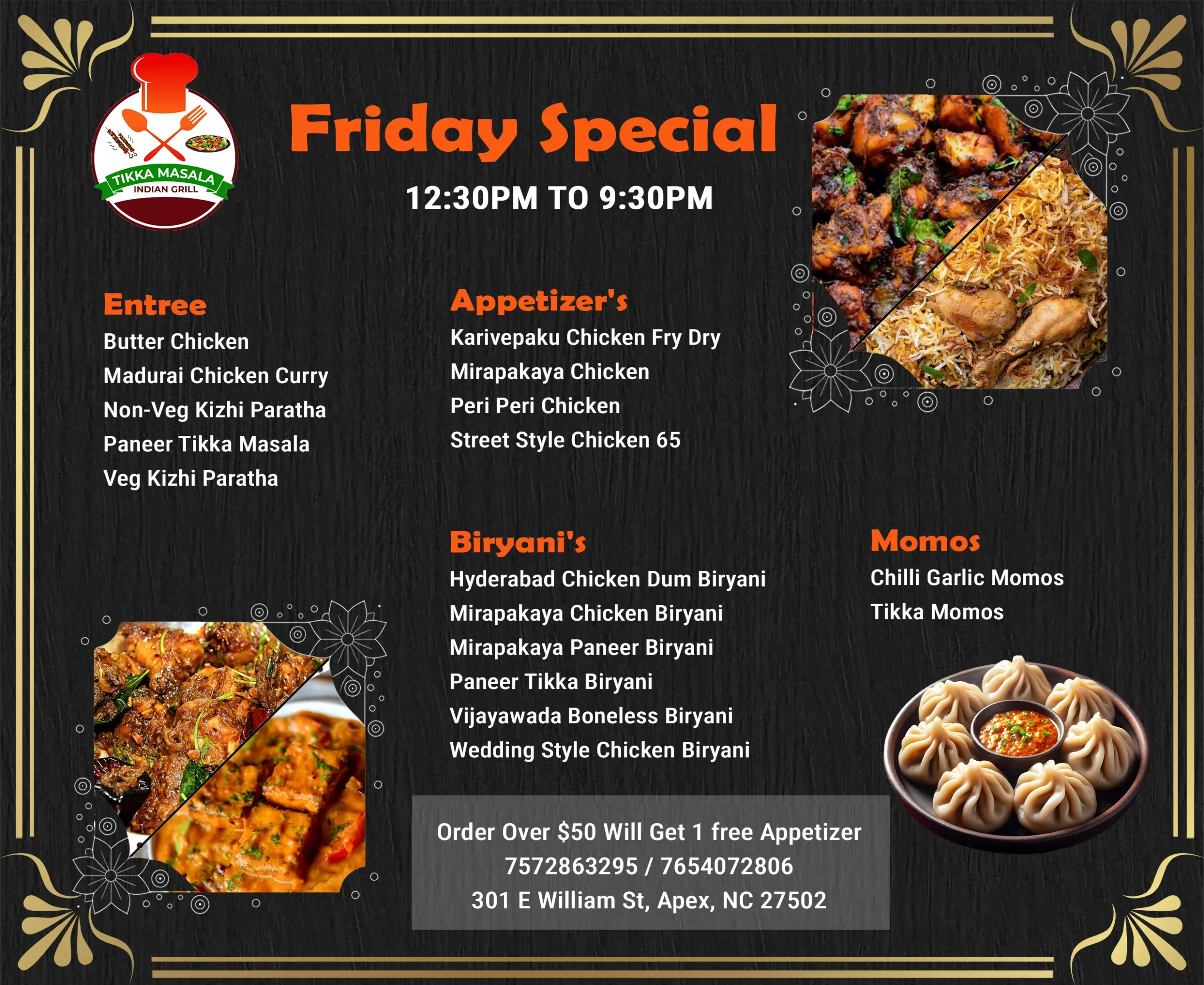 Enjoy exclusive Friday specials featuring your favorite Indian dishes, freshly prepared and full of flavor. Don’t miss out — taste the best this Friday at Tikka Masala!